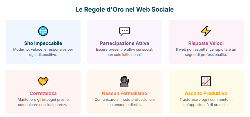 Il web non consente errori. Un’azienda che si presenta sul Web deve avere un’immagine impeccabile, un sito moderno, agile, attrattivo, facilmente interpretabile e consultabile, meglio se con un layout responsive che permetta l’accesso con diverse tipologie di devices, una sezione dove gli utenti possano postare i loro commenti e le loro richieste, meglio se integrata con un live chat. Inoltre un’azienda che decide di aprirsi al Web 2.0 in modalità Social dovrà obbligatoriamente essere presente sulle varie piattaforme (Facebook, Twitter, Linkedin ecc…) e essere su queste piattaforme attiva e partecipativa, niente di istituzionale, niente formalismi, professionalità, correttezza e mantenimento degli impegni presi con gli utenti, risposte veloci ai quesiti e alle richieste di informazione faranno il resto nella conoscenza profonda e l’interscambio produttivo tra il mercato e l’azienda.