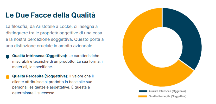 Quindi risulta corretto dire che un oggetto, un servizio, un prodotto, un’azione, una relazione, un rapporto umano, in definitiva qualsiasi cosa, ha una Qualità Intrinseca sua propria e una Qualità, come dire… percepita. E questa qualità percepita è, di conseguenza, dipendente da chi la percepisce.