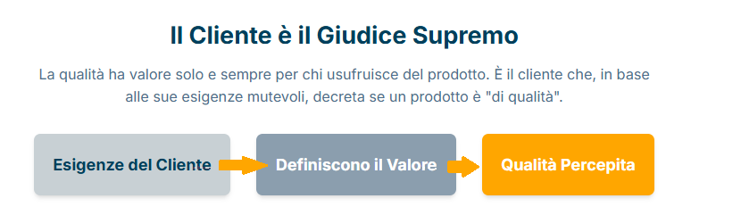 Che relazione ha tutto questo con la qualità di un processo produttivo, con la qualità di un servizio, di un rapporto, di una relazione? La risposta dovrebbe a questo punto venire molto semplicemente: La Qualità ha valore solo e sempre per chi usufruisce del servizio, prodotto, oggetto o relazione (d’ora in poi ci limiteremo a chiare tutte queste “variabili” Prodotto) che la “contiene”. Per il Cliente.