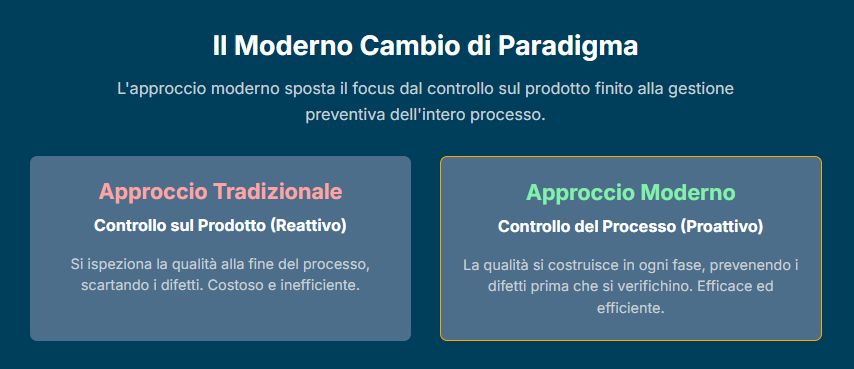 In sintesi, l’approccio moderno alla Qualità sposta il focus dal controllo finale del prodotto al controllo preventivo del processo. L’Azienda non controlla la Qualità, ma la costruisce in ogni fase della sua attività, garantendo che ogni passaggio sia massimamente efficace ed efficiente per centrare l’unico obiettivo che conta: il valore attribuito dal Cliente.