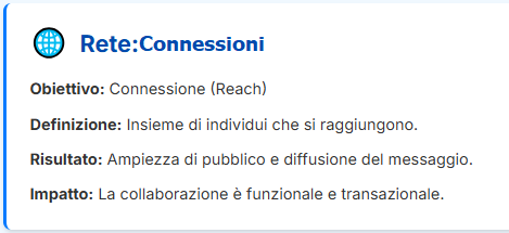 • Connessioni si riferisce al numero di persone che una rete o un individuo può raggiungere o influenzare. Una reste estesa significa che c’è un ampio pubblico che può ricevere un messaggio o un’idea. Tuttavia, avere una grande portata non significa necessariamente avere una forte comunità o il potere di influenzare il cambiamento.