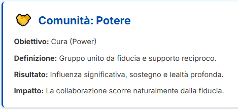 • Comunità, invece, è un gruppo di persone che condividono interessi o obiettivi comuni e che interagiscono regolarmente. Una comunità è più di una collezione di individui: è un gruppo che lavora insieme per raggiungere obiettivi comuni e che offre supporto ai suoi membri. I membri di una comunità hanno un senso di appartenenza e lealtà, e sono più propensi a collaborare per raggiungere i loro obiettivi condivisi.
