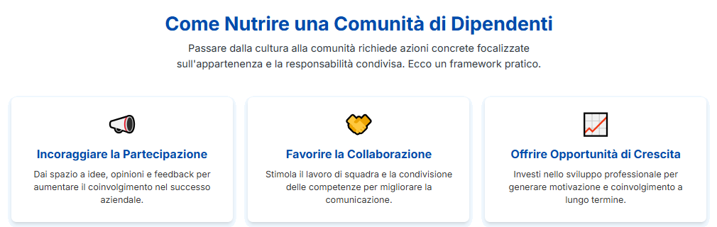 Per passare dalla semplice cultura alla comunità, l’azienda deve concentrarsi su azioni concrete per favorire l’appartenenza e la responsabilità condivisa: